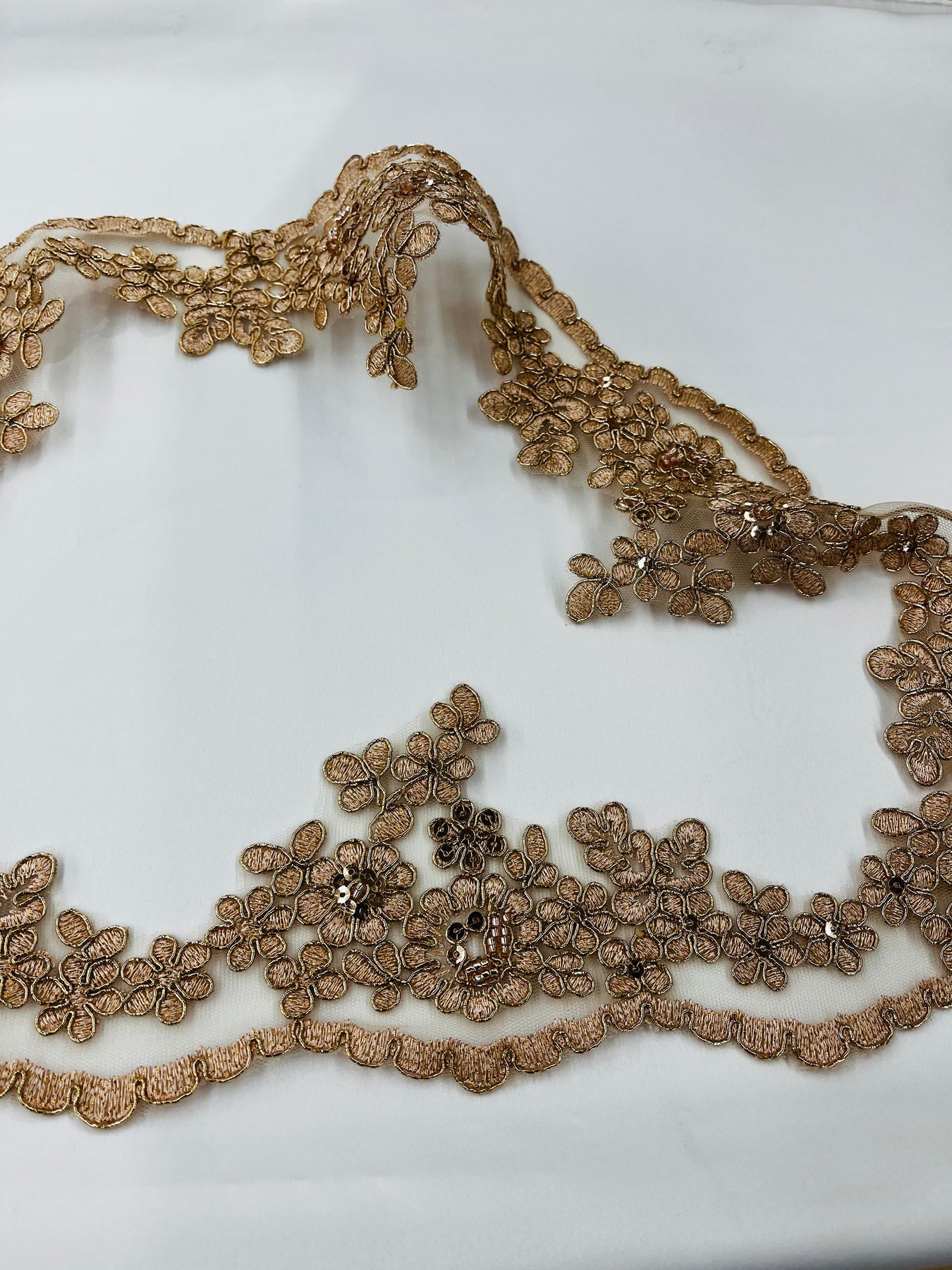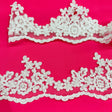 Elevate your bridal gowns, evening dresses, quinceanera outfits, and dance costumes with this exquisite Beaded & Corded Lace Trimming embroidered on 100% polyester net mesh. Handmade with high quality lightweight fabric, this 4 inch wide trim features intricate beadwork and corded embroidery, adding a luxurious and refined accent to any special occasion garment. Ideal for weddings, formal events, and festive costumes, this couture lace trim brings timeless elegance and sophistication to your creations.