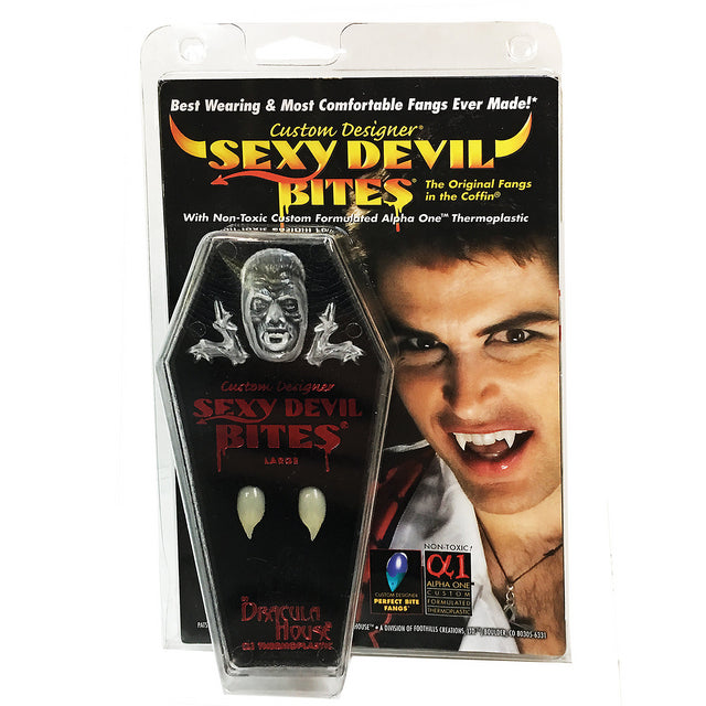 The Original Custom Designer Sexy Devil Fangs are loved by party-goers and actors worldwide because of their natural look and secure fit that enables them to talk easily and naturally, as well as drink cold beverages! Natural tooth color and superior product quality and finish make these the finest fangs available! Custom Designer Fangs can be worn many times without refills or adhesives.