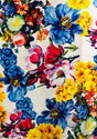 This vibrant stretch velvet features a multicolor floral print in white, blue, red, yellow, and green tones for bold, eye catching appeal. The fabric is soft, flexible, and has a 2 way stretch, making it suitable for garments, upholstery, or decorative projects. Crafted from 96% polyester and 4% Lycra spandex, it measures 60 inches in width and is sold by the yard in a continuous cut. Perfect for sewing custom fashion pieces, curtains, or creative crafts that need both color and drape.