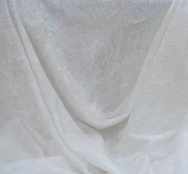 This optic white stretch crushed velvet fabric is made from 90% polyester and 10% spandex, offering a luxuriously soft hand and fluid drape. With stretch across the grain, it is ideal for garments like skirts, leggings, tops, evening wear, and dance costumes. It also works beautifully for home décor, holiday projects, and creative crafts. Machine washable (cold). Sold by the yard.