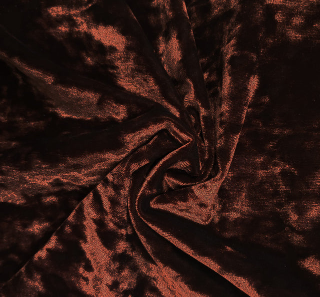 This rust-colored stretch crushed velvet fabric is crafted from a blend of 90% polyester and 10% spandex. It offers a silky soft hand feel, elegant sheen, and excellent drape with cross-grain stretch. Suitable for evening wear, dance costumes, skirts, leggings, tops, and festive holiday outfits. Also works well for event décor, home textiles, and craft projects. Machine washable (cold). Sold by the yard.
