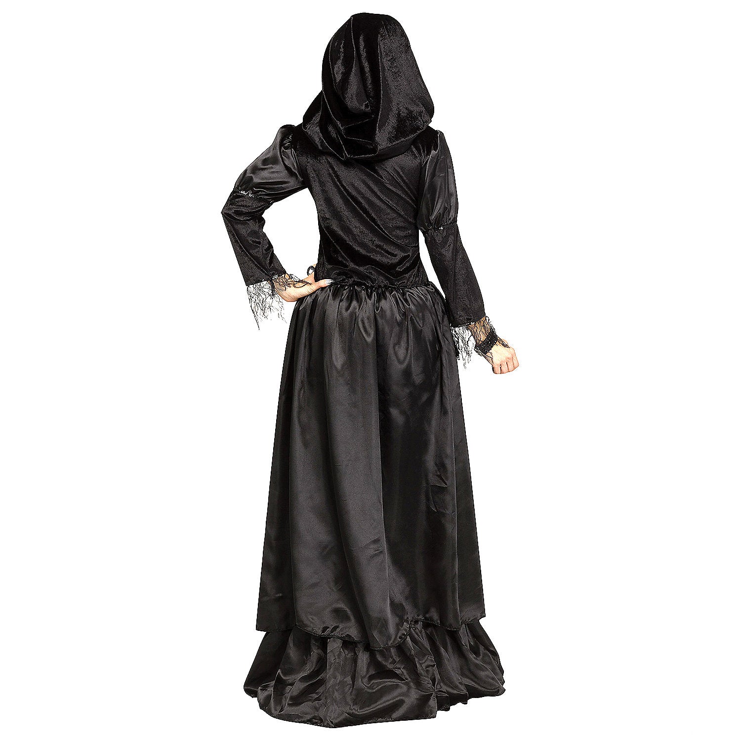 - Elegant gothic design with hooded bodice and sleeve cuffs with rose lace