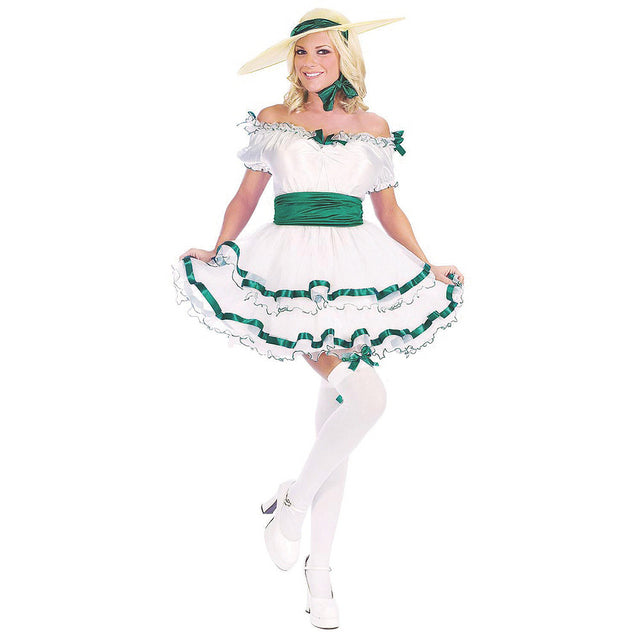 You can be a true Southern Belle this Halloween in our beautiful sassy costume for women. The polyester dress is white with green ribbon trim and comes with a cute hat and green matching ribbon, white lace gloves, and white thigh highs trimmed with green ribbon. Dress up while handing out candy to the neighborhood kids, for going out for trick-or-treat night, or attending a Halloween costume party. This costume will delight you and others.