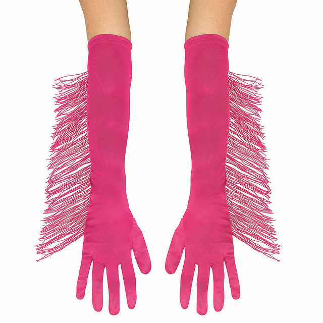Adults Long Polyester Gloves with Pink Fringe Costume Accessory