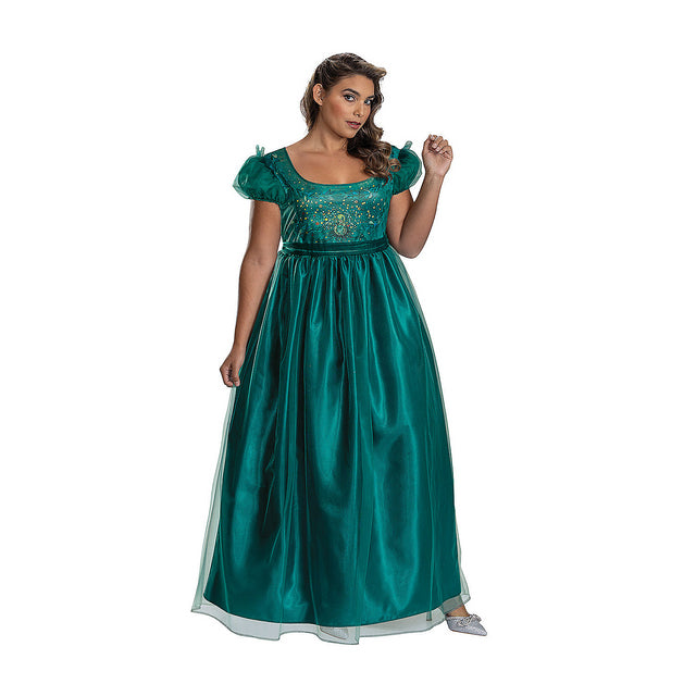 Bridgerton fans will be delighted to look just like Penelope Featherington when wearing our Classic Penelope Costume! This stunning costume features a lovely, full-length, high-waisted gown in rich teal satiny fabric, complete with a sheer overlayer on the puffed sleeves and the full skirt. The bodice boasts printed sparkle accents and delicate ruffle trim on the shoulders, creating an elegant look fit for any themed event.