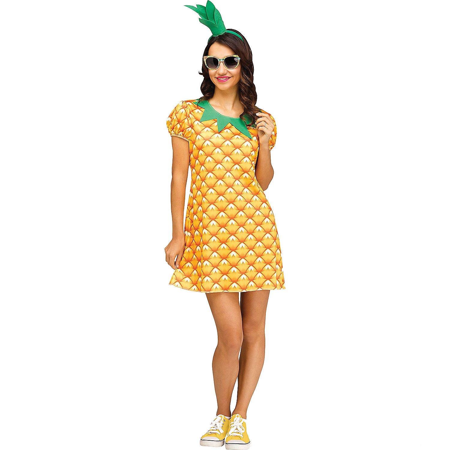 Transform into a delightful fruit with our Fun Pineapple Cutie Adult Costume, perfect for anyone looking to bring sweetness and charm to their next costume event. This vibrant outfit features a colorful dress adorned with a realistic pineapple graphic, accompanied by a matching headband for a cohesive look.