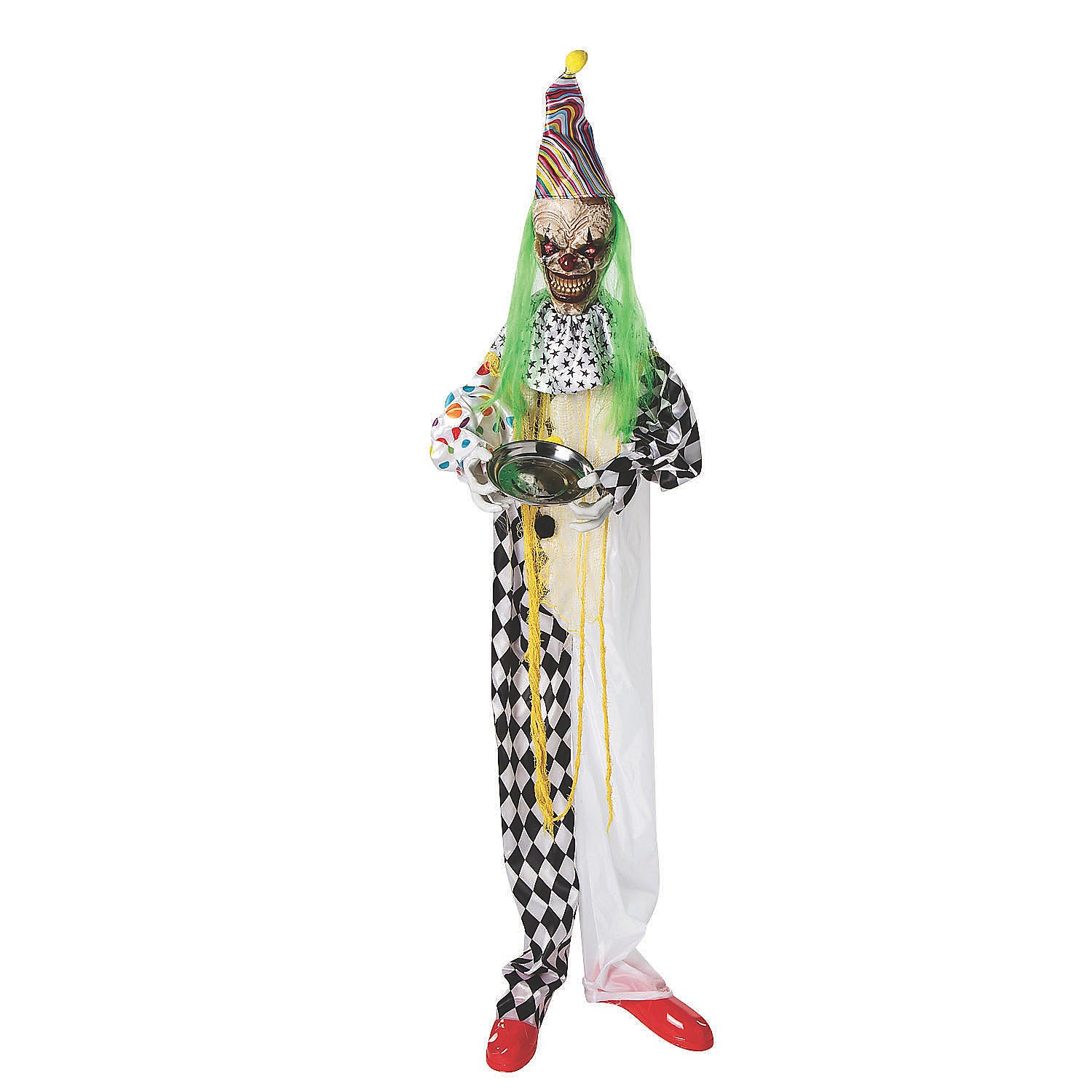 This eye-catching Halloween decoration is a real head turner! The clowns outfit features a colorful polka dot pattern, checkerboard pattern, stars on a white background, a striped, multicolor hat, and bright red shoes. This combination of designs will seem disturbing to passersby or guests to your Halloween party until they get a look at the clowns dark and scary skeletal face with its maniacal grin. To add to the eerie chill, this clown turns its head, as well. This ghoulish clown is the perfect addition to a haunted carnival or any fright night front porch display. Batteries required.
