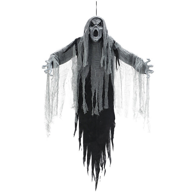 Calling from beyond the grave with a mournful spine-tingling wail, the 60" Ghostly Howling Phantom sets a terrifying haunted mood. His glowing white LED eyes pierce your soul and his posable arms with long skeletal fingers reach out to enfold you in a deathly embrace! Hang anywhere you need to add a ghostly feel.