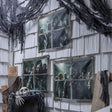 Enhance your Halloween decorations with our 2 Ft Zombies in the Window Door Curtain. This unique decoration features realistic images of zombies appearing through a window frame, setting the perfect spooky atmosphere for parties or haunted house setups.
