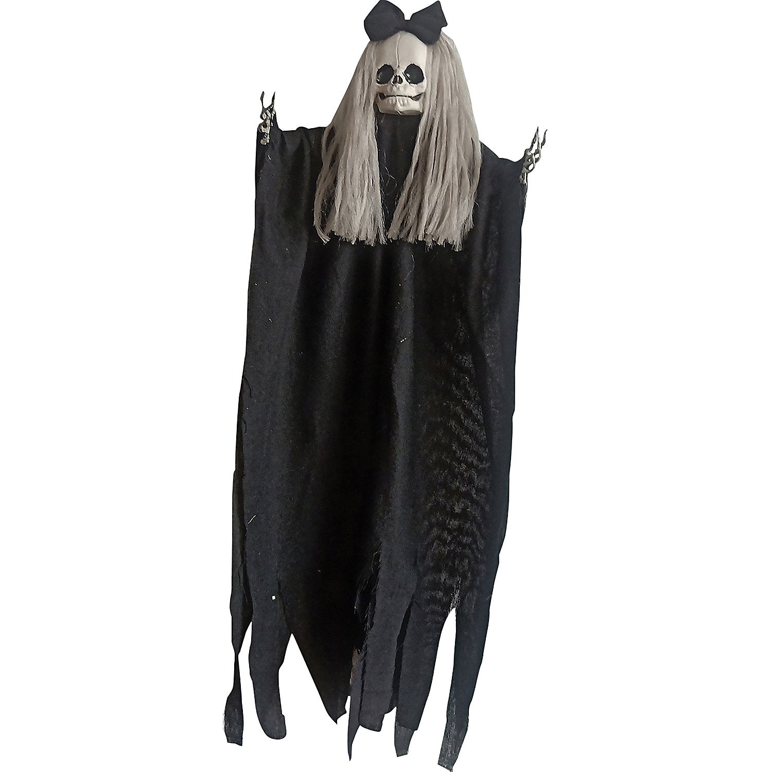 The creepy little puckered skull face of our Hanging Doll Prop is sure to unsettle guests and anyone who takes a look! Long dry weathered grey hair is centered around a big black bow that matches her long black robe. The abnormally large forehead gives an offputting feel, and poseable arms with long skeletal hands appear to reach out toward you! Don't miss out on this unique find for this season! Measures 36 inches tall x 19 inches wide x 4 inches deep. Convenient hanging loop allows easy setup.
