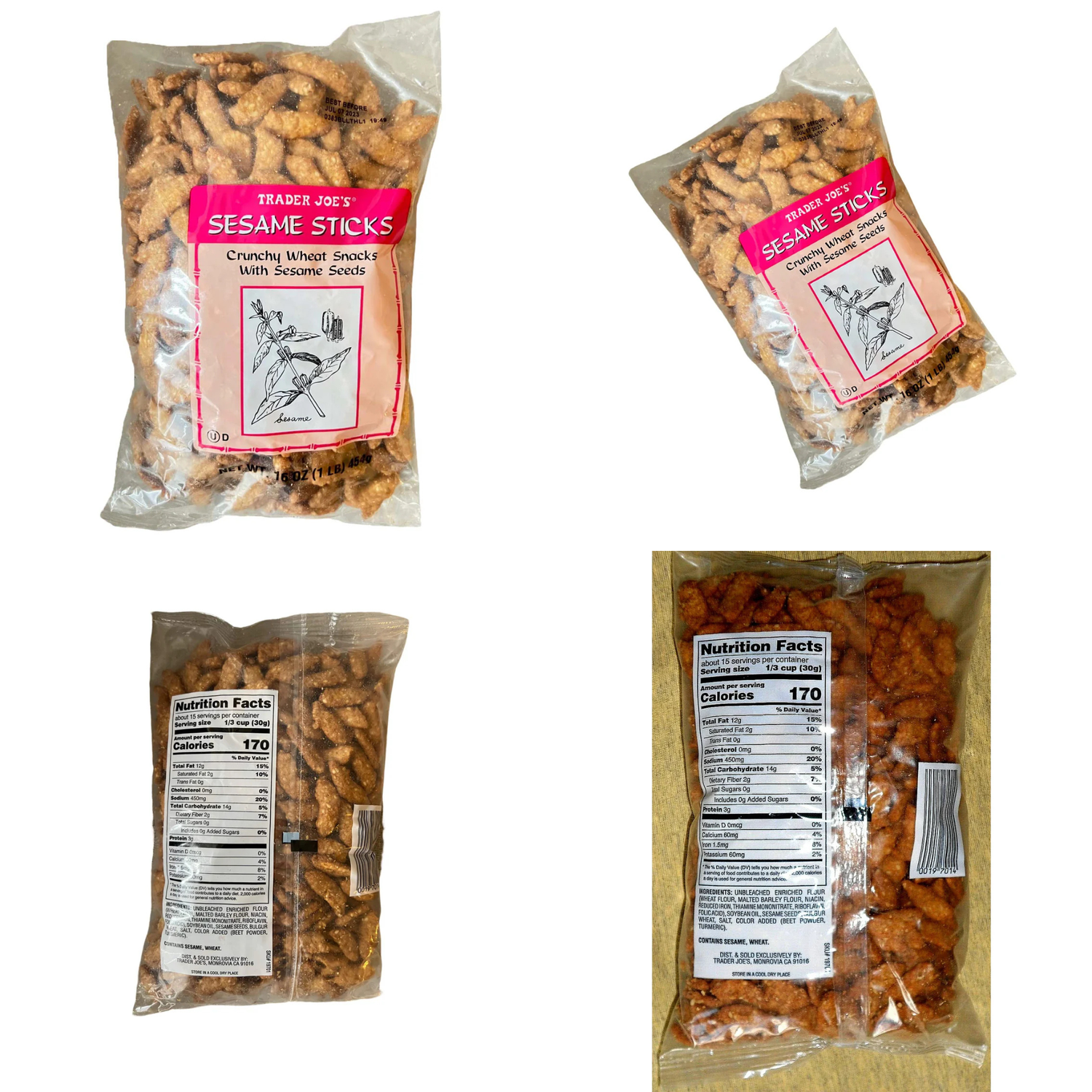 Snack smarter with Trader Joe's Sesame Sticks, a crunchy and savory treat perfect for any occasion. Packed in a convenient 16 oz bag, these golden, sesame-coated sticks are great for snacking on their own or adding a delightful crunch to salads and trail mixes.