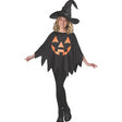 A classic family friendly Halloween outfit. This pumpkin tunic is an easy way to dress up for school events and fall festivals. The Adult Jack O Lantern Pumpkin Poncho features a black poncho with jagged-cut on hem and orange pumpkin face design on front. One size fits most adults 4-14.