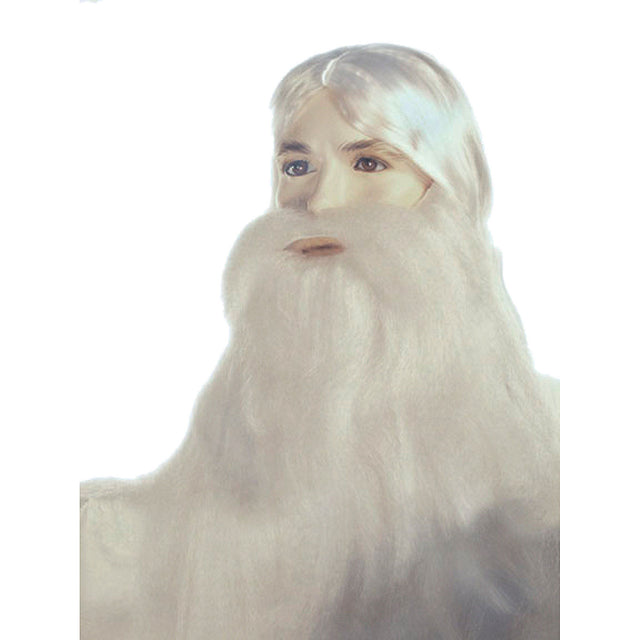 A great wig and beard set for wizards. Father Time, rock bands, or medieval characters—so many uses. Wig is 28 inches long, beard is 26 inches long; approximately waist length.