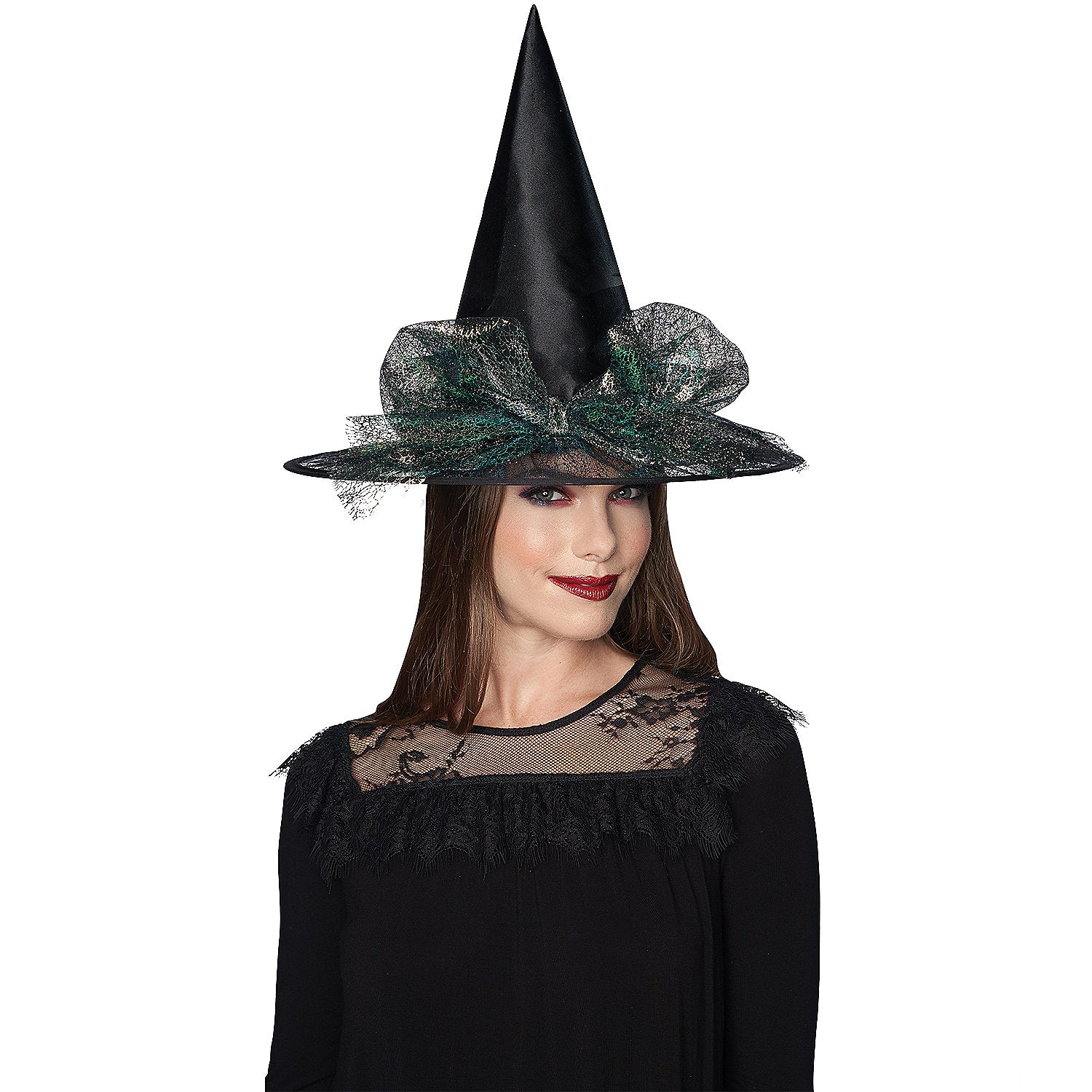 Finish off your witchy costume with this enchanted hat! A tall pointed black satin polyester body is complimented by a sheer shimmer greenish blue tulle lace brim, supported by a wire around the edge. A large shimmer lace bow finishes the look off with a unique and stylish flair. A must have polished and sophisticated accessory to complete an upscale spellcaster ensemble!