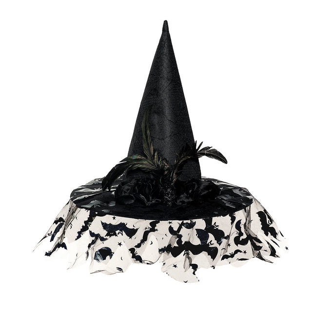 Become the most elegant of witches when you add this amazing Witch Hat to your simple black dress or witch costume! Our Deluxe Witch Hat is made of a satiny black fabric and covered with a spiderweb lace print. Lovely flower and feathers trim the band and an elegant sheer veil with a bat pattern drapes over the wide brim. Perfect for Halloween events and costume parties, this accessory adds a touch of mystery to your look.