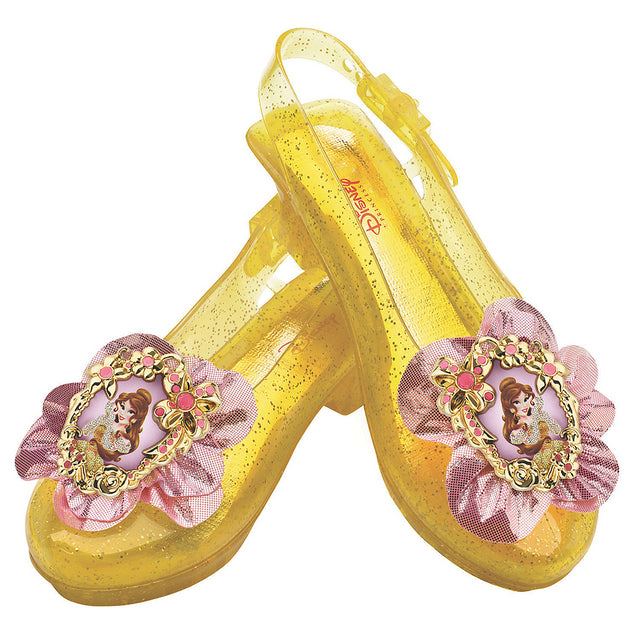 Inspired from the Disney movie, Beauty and the Beast, these adorable sparkling Princess Belle shoes will add a magical touch to your little ones princess costume. Complete your Disney Princess Belle costume with the Disney Belle Sparkle Shoes. These shoes feature one pair of sparkly yellow sling-back costume shoes with adjustable strap and attached Belle character cameo with pink ribbon trim. One size fits most children.