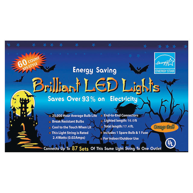 Enhance your indoor or outdoor Halloween decorations by letting the glow of these lights shine! This string of orange lights is a must-have if you enjoy creating a haunting atmosphere through Halloween lights! 12" lead, 4" cut and 4" end. 16 ft. lighted length.