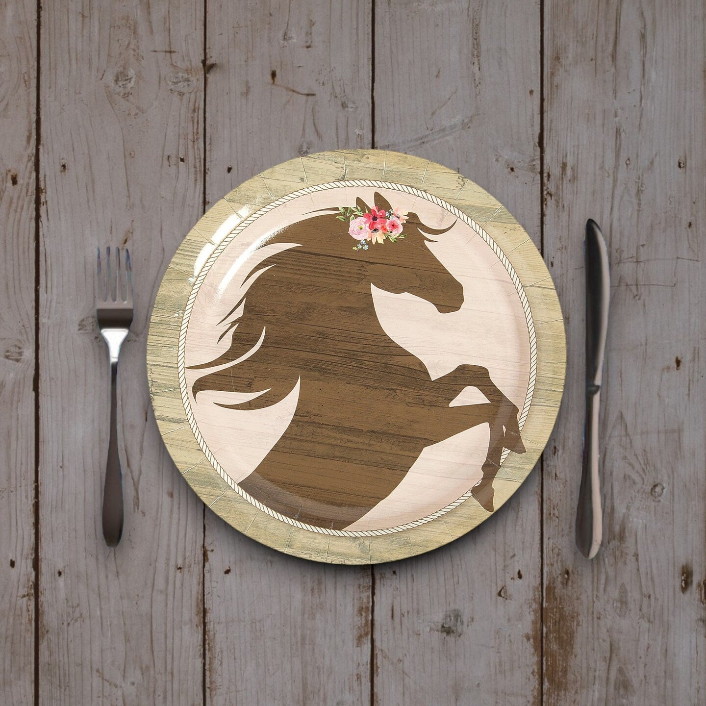 Add a charming touch to your horse-themed party with these Crown of Flowers Horse Party paper dinner plates. Each 9 1/2 inch plate features a graceful horse silhouette surrounded by a halo of delicate flowers set against a rustic shiplap background. Perfect for birthdays, bachelorette parties, weddings, and any horse lovers celebration, these disposable plates make serving and cleanup effortless. Delight your guests with these pretty plates that blend elegance with fun.