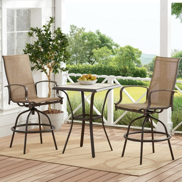 The MFSTUDIO 3-Piece Outdoor Swivel Bar Set brings comfort and style to any patio, deck, or balcony. Featuring a tall bistro-style design, two smooth-swivel bar chairs, and a sturdy high-top bar table, this set offers the perfect spot for outdoor dining, relaxing, or entertaining. Built with durable materials and a stylish brown finish, it enhances any outdoor setting with long-lasting performance.