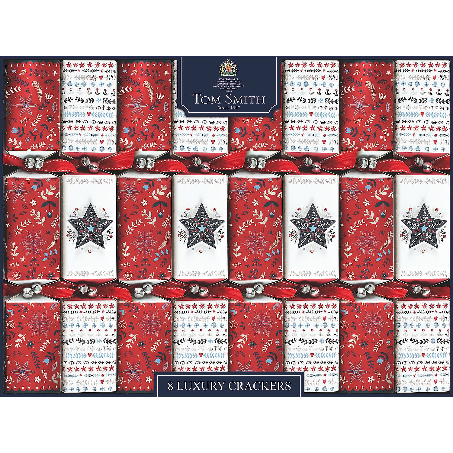 These beautiful Christmas party crackers come packed with a prize inside and feature red and white wrappers with ornate foliage and star designs. Set these out on the dinner table at your next Christmas party to encourage your guests to pair up and partake in the classic holiday tradition of pulling the crackers apart to see who gets the bigger half and the prize. Prize assortment varies.