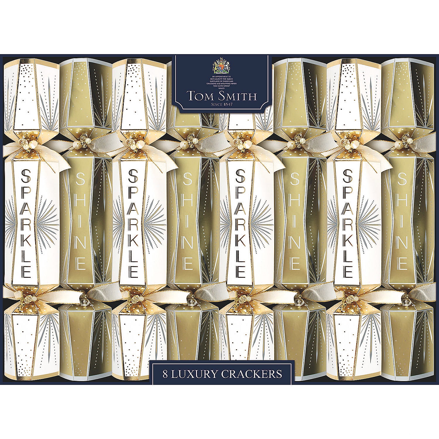 These beautifully stylish Christmas party crackers come packed with a prize inside and feature gold and cream wrappers with the words, "Sparkle," and "Shine," in the design. Set these out on the dinner table at your next Christmas party to encourage your guests to pair up and partake in the classic holiday tradition of pulling the crackers apart to see who gets the bigger half and wins the prize. Prize assortment varies.