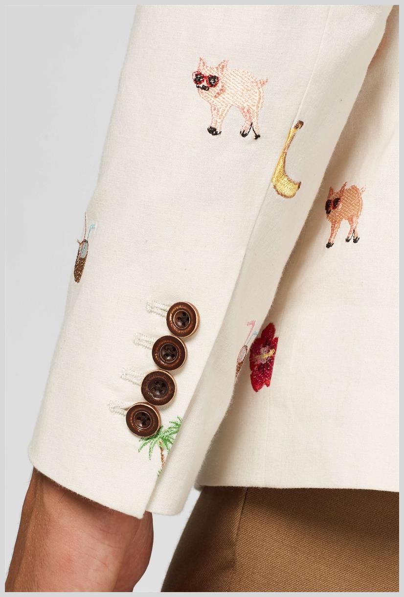 This off-white OppoSuits Deluxe blazer is designed to make you feel comfortable from the beach to the bar, from the office to a wedding and all places in between. Made of a lightweight cotton-linen mix, finished with all-over tropical embroideries, this blazer lends a breezy and subtle humorous touch to your formal look.