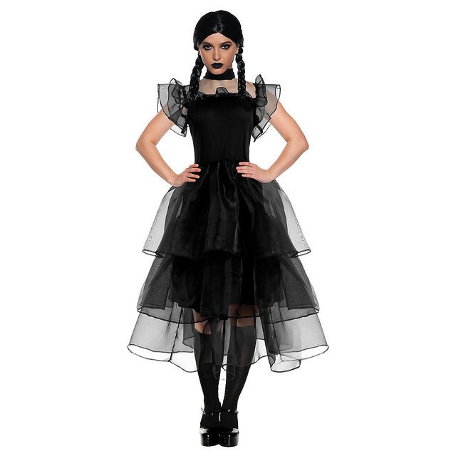 Create Instagram-worthy looks with our Women's Gothic Prom Dress Costume. Flaunt your fashion sense and individuality by wearing this visually stunning dress that is sure to impress both in person and on social media. The enchanting black fitted bodice features sheer shoulders with ruffled layered butterfly sleeves, while the full-length gathered skirt has multiple sheer layers for a dramatic effect.