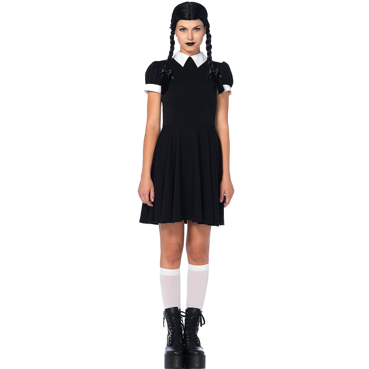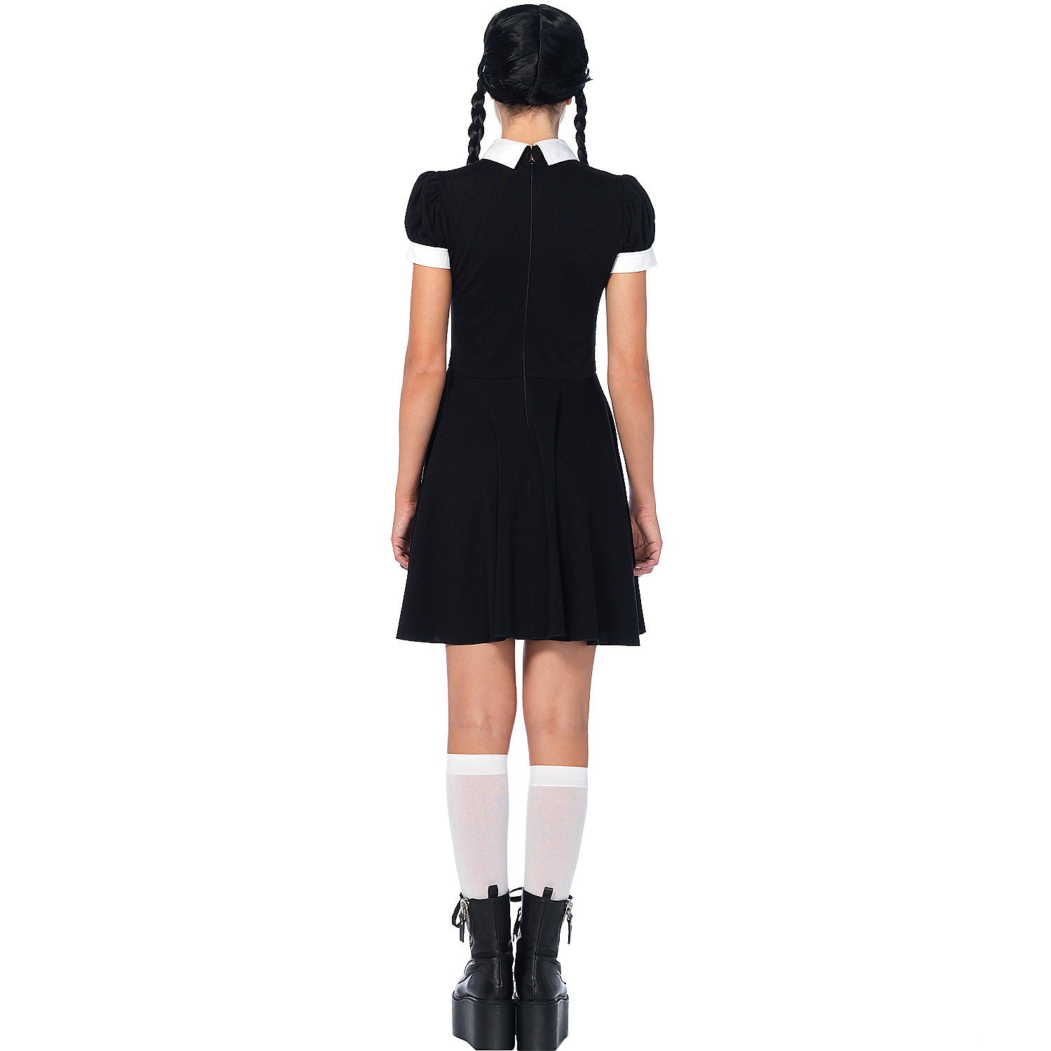 Celebrate Halloween in style with our Gothic Darling Wed Adult Costume, a perfect choice for haunted gatherings, costume parties, and themed events. This elegant costume features a stunning black dress with a snow white collar and puffed sleeves, complemented by a matching black braided wig adorned with black satin bows, allowing you to create a striking gothic look.
