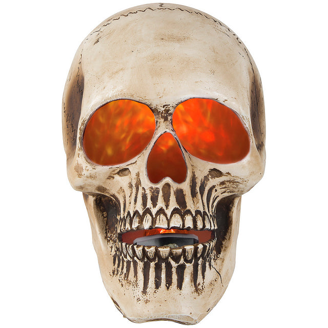 Kick up the fright factor with our LightShow Projection Fire & Ice Skull. This amazing spotlight features an aged skull exterior that projects a blazing light effect from the back. Perfect for creating an eye-catching focal point on indoor or outdoor surfaces, the Fire & Ice Skull projects up to 15-ft wide with realistic, flickering flames.