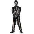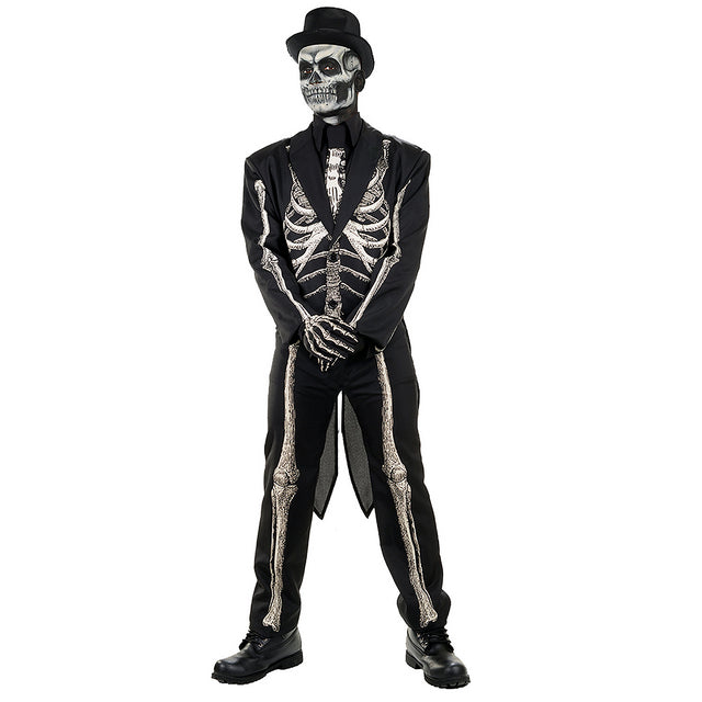 A striking costume perfect for any slightly-skewed formal event, goth gathering, or Halloween event. You will be the best-dressed man at the blood sacrifice! This costume features a screen-printed skeletal design tuxedo jacket with tails, a faux shirt front with tie, pants, and gloves. The skeleton is printed on both sides of the suit.