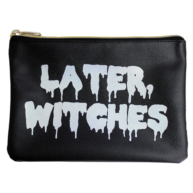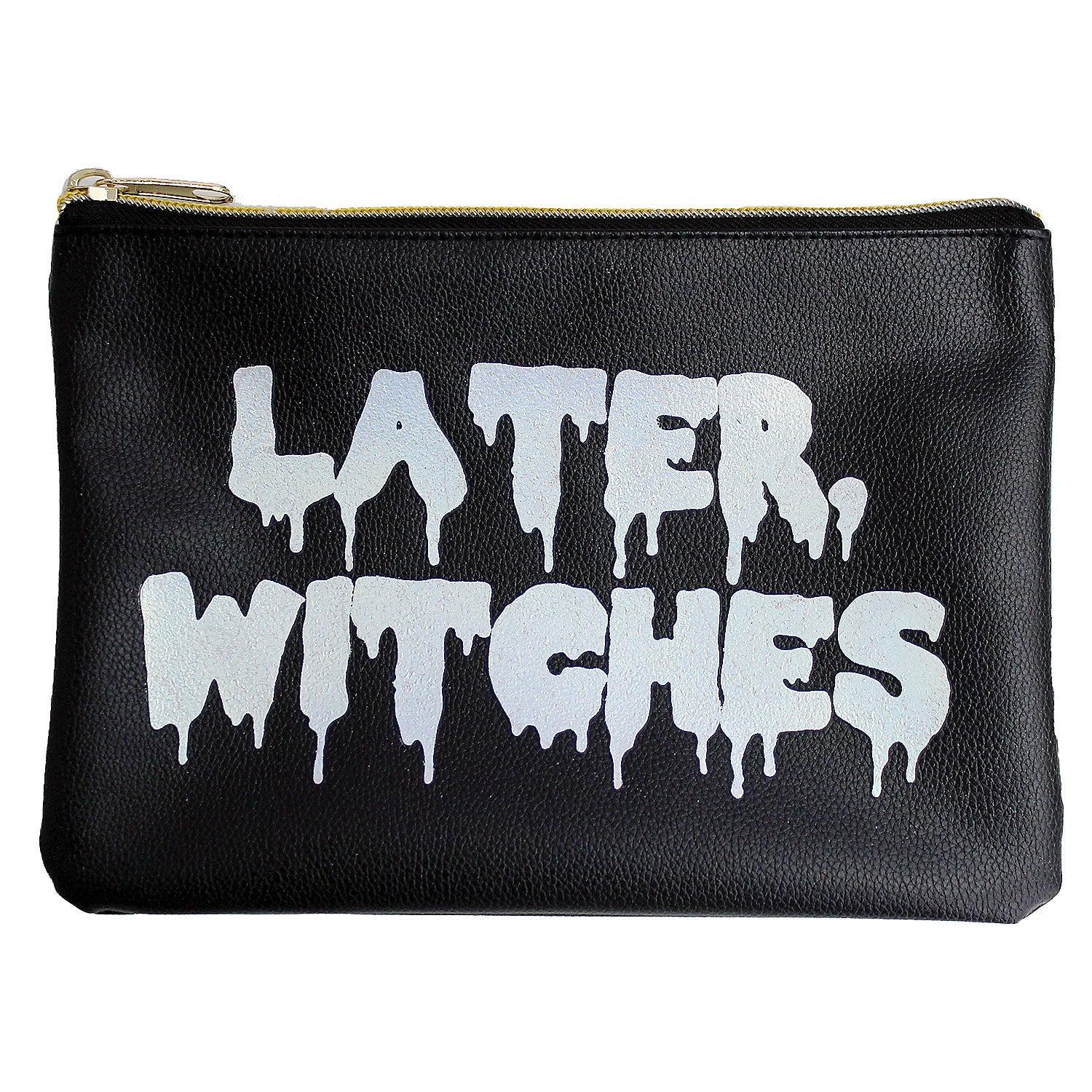 A great-looking and fun makeup bag that can also be used as a small purse if needed. Great for Halloween or anytime of the year! This plastic makeup bag features an iridescent reflective print that reads "Later, Witches". Approximately 8 inches wide and 5.5 inches deep, it's the perfect size for storing essential beauty items or as a whimsical accessory.