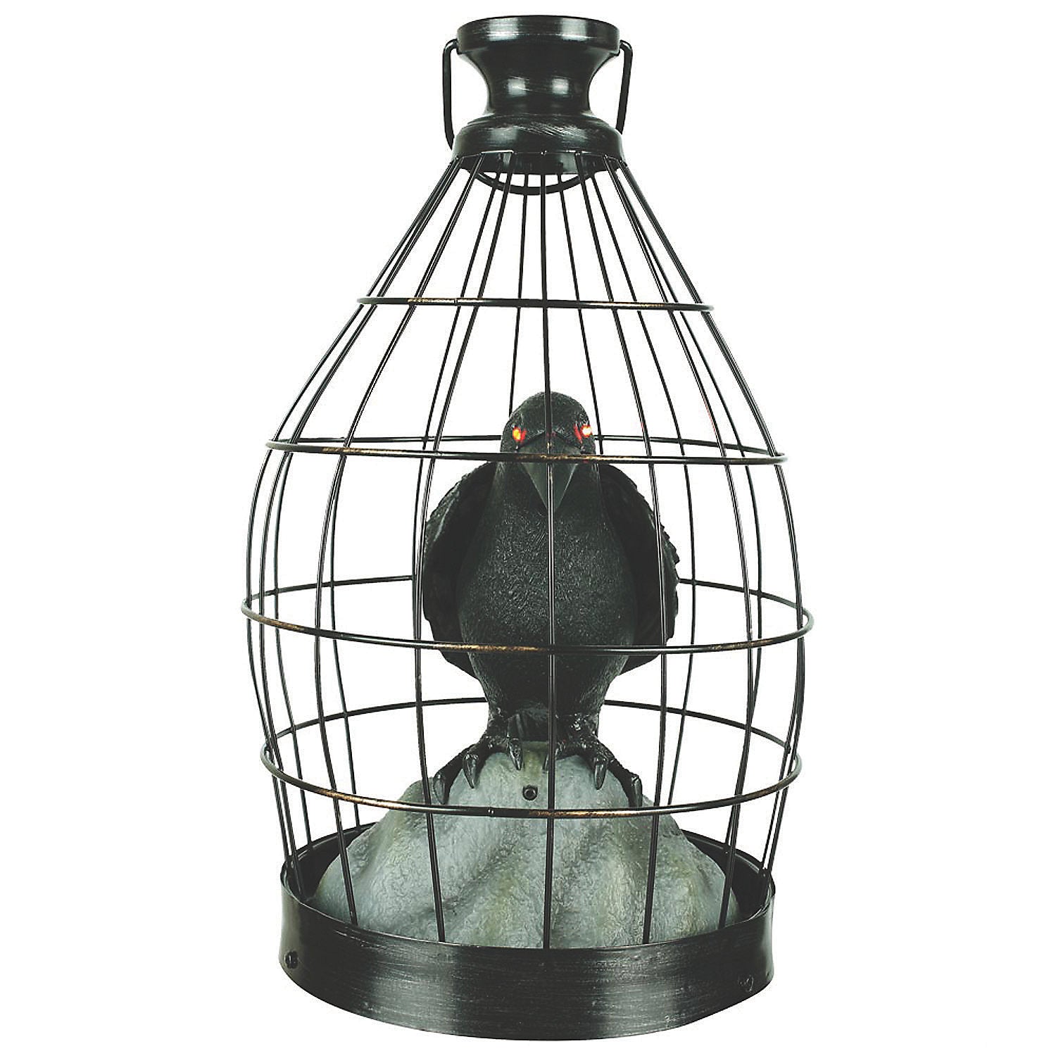 This creepy caged black crow flaps its wings and squawks when someone is near. Welcome guests to your Halloween party with this frighteningly unique Halloween decoration. This crow is also a fantastic prop for a haunted house. From his metal prison, your new feathered fiend watches the world with glowing eyes. Sound and motion activated.