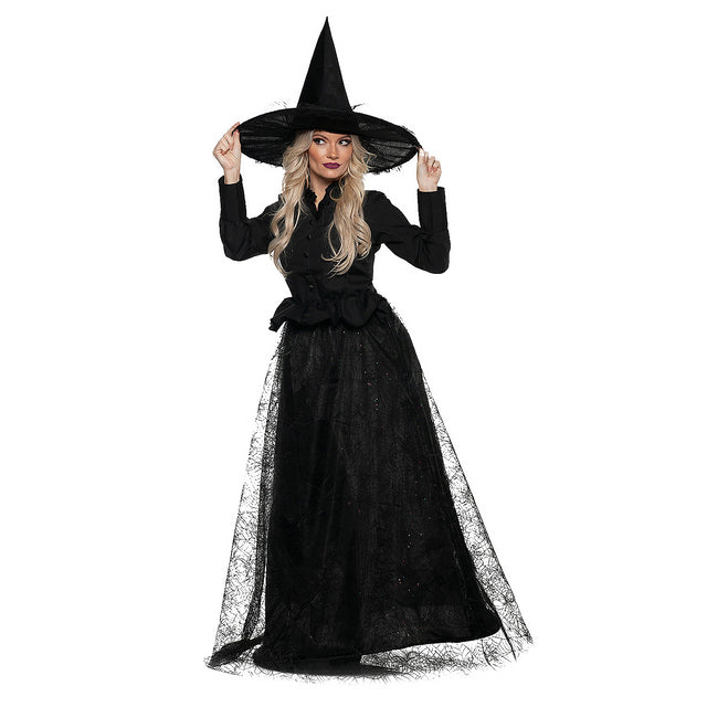 She may be wicked, but she is elegant! Transform into a classic witch with our beautiful Wicked Witch Adult Costume. This enchanting outfit includes a full-length button-front black dress with a flared skirt and a sheer spiderweb lace gathered-skirt overlay, complete with a matching traditional witch hat adorned with spiderweb lace trims.