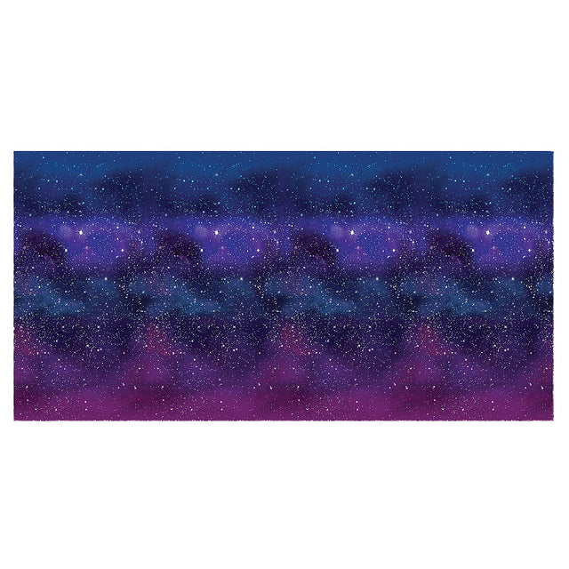 This great galaxy backdrop will be great for any event or party with a science fiction or space theme. Great for photo ops. This plastic backdrop features a purple and black galaxy design. Can be attached to the wall with tape. Measures 4 ft. x 30 ft.