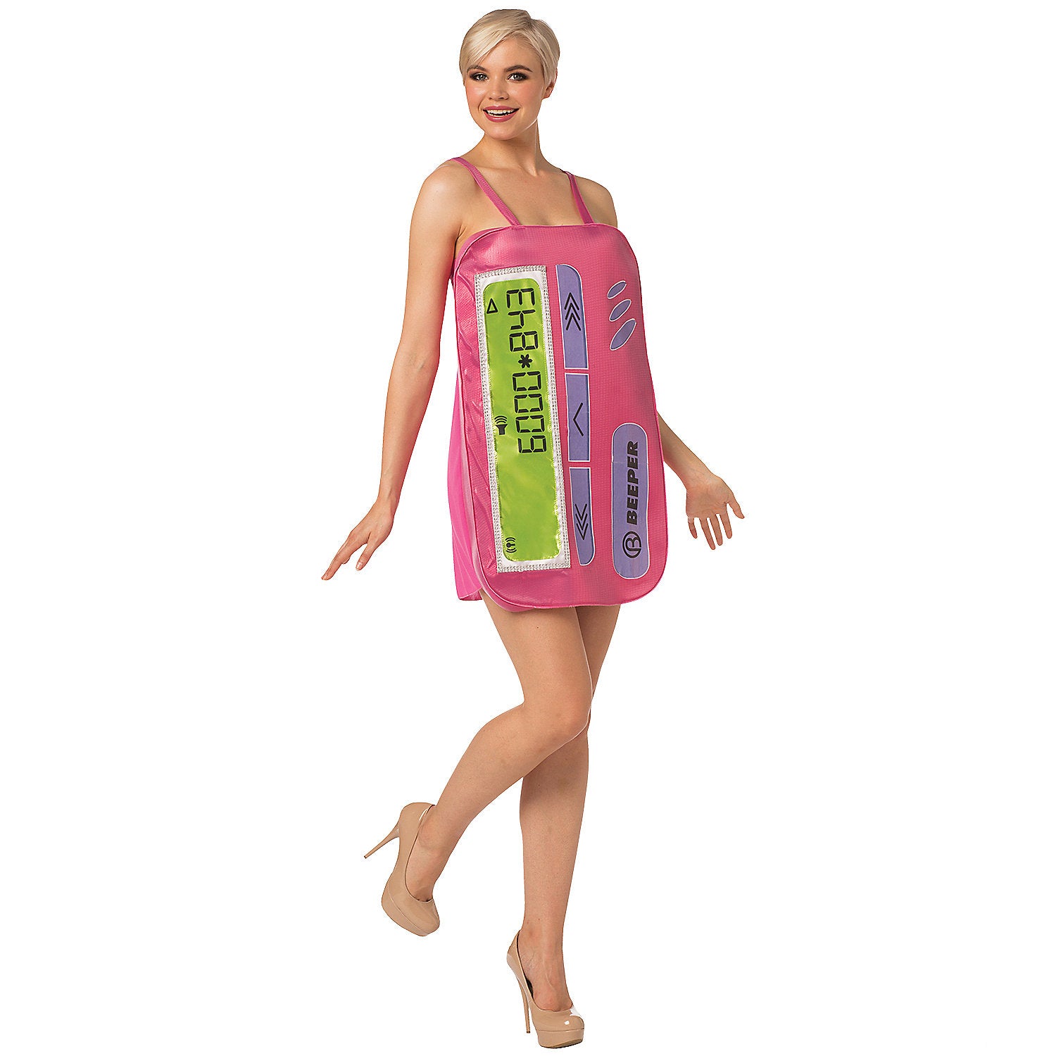 Show your taste for 1980s fashion with this wonderful Beeper Dress Adult Costume. This fabulous costume is perfect for any 80s party or Halloween bash and includes a one-piece pink mini dress printed on the front, made from 100% polyester.