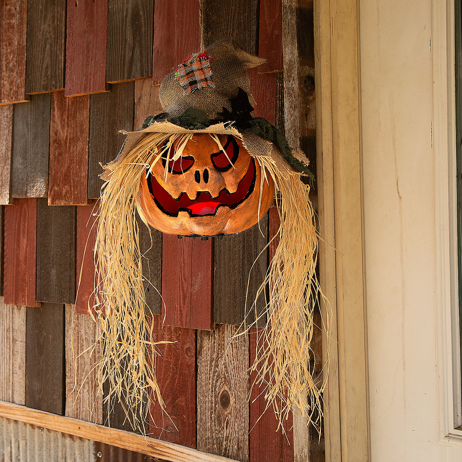 This hanging pumpkin head plastic decoration adds a spooky yet charming touch to your Halloween décor. Featuring a mischievous smile straw-like hair that moves with the autumn breeze and a brown floppy hat this over two foot long decoration makes a perfect festive centerpiece. Made from durable plastic it measures 11.75 by 5.75 by 27.5 inches and is easy to hang for indoor or covered outdoor use. Bring fun and fright to your Halloween festivities with this unique pumpkin head decoration.