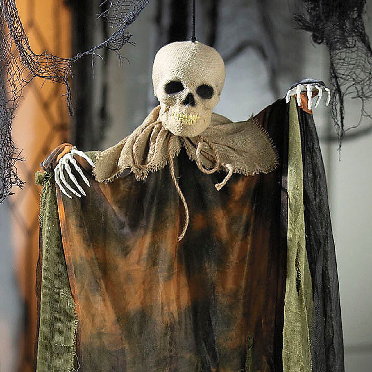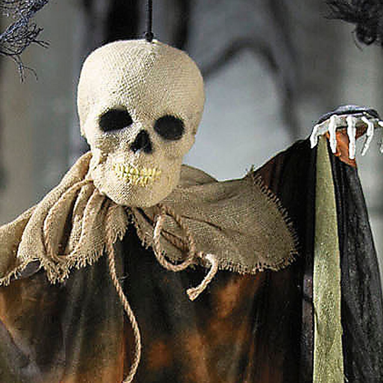 Create a haunting focal point for your Halloween décor with this hanging pumpkin man featuring a burlap skeleton head. Designed with tattered orange and black clothing and a grimacing jack o lantern face, it brings eerie character to haunted house scenes. The attached cord makes it easy to hang from ceilings, porches, or trees for a chilling effect. Crafted from lightweight polyester, it’s perfect for seasonal indoor and covered outdoor displays.