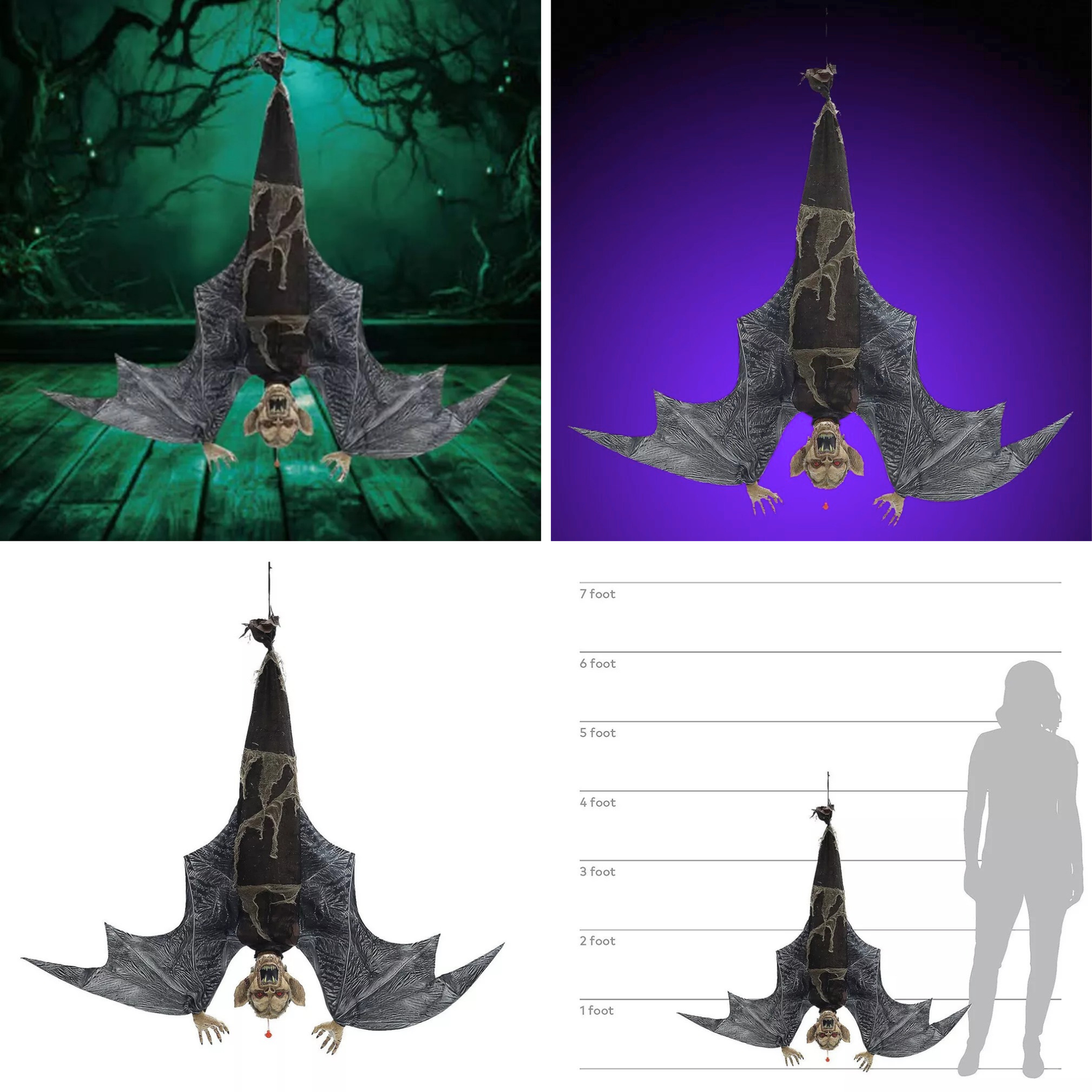 Turn up the terror with this Menacing Hanging Bat, a 46-inch animated Halloween decoration designed to bring your haunted house or party to life. This spooky flying creature features glowing red LED eyes, a head that turns side to side, and unsettling screeching sounds. Its wings gently move as it hangs, creating a lifelike and eerie motion in the breeze. Perfect for doorways, porches, trees, or indoor scenes, this animatronic prop is sure to frighten and delight.