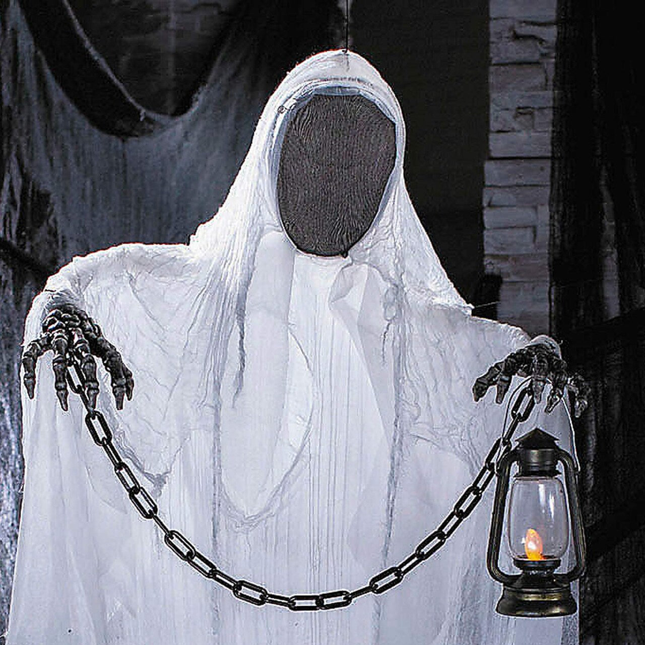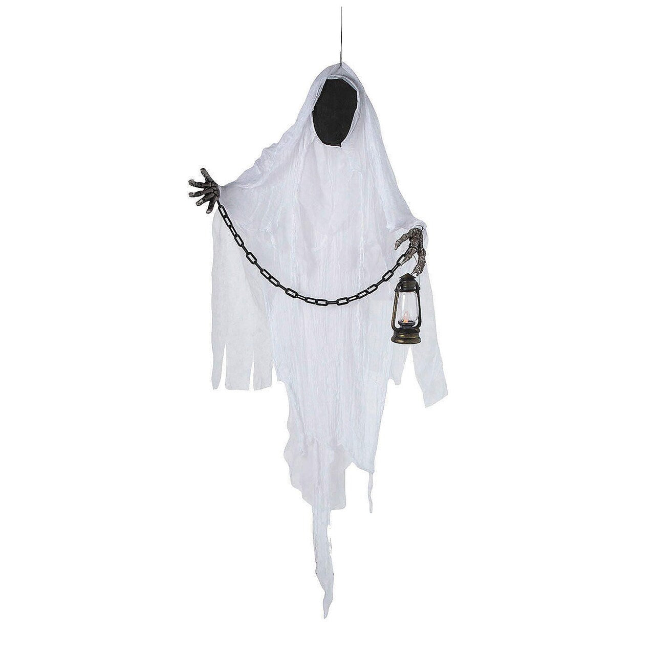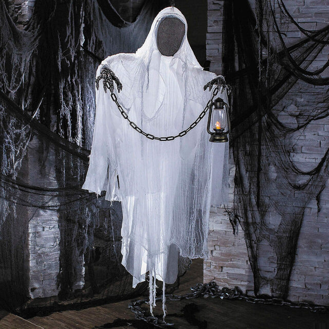 • Design: Features a faceless ghost holding a lantern in one hand and a chain between both hands for a spooky effect.