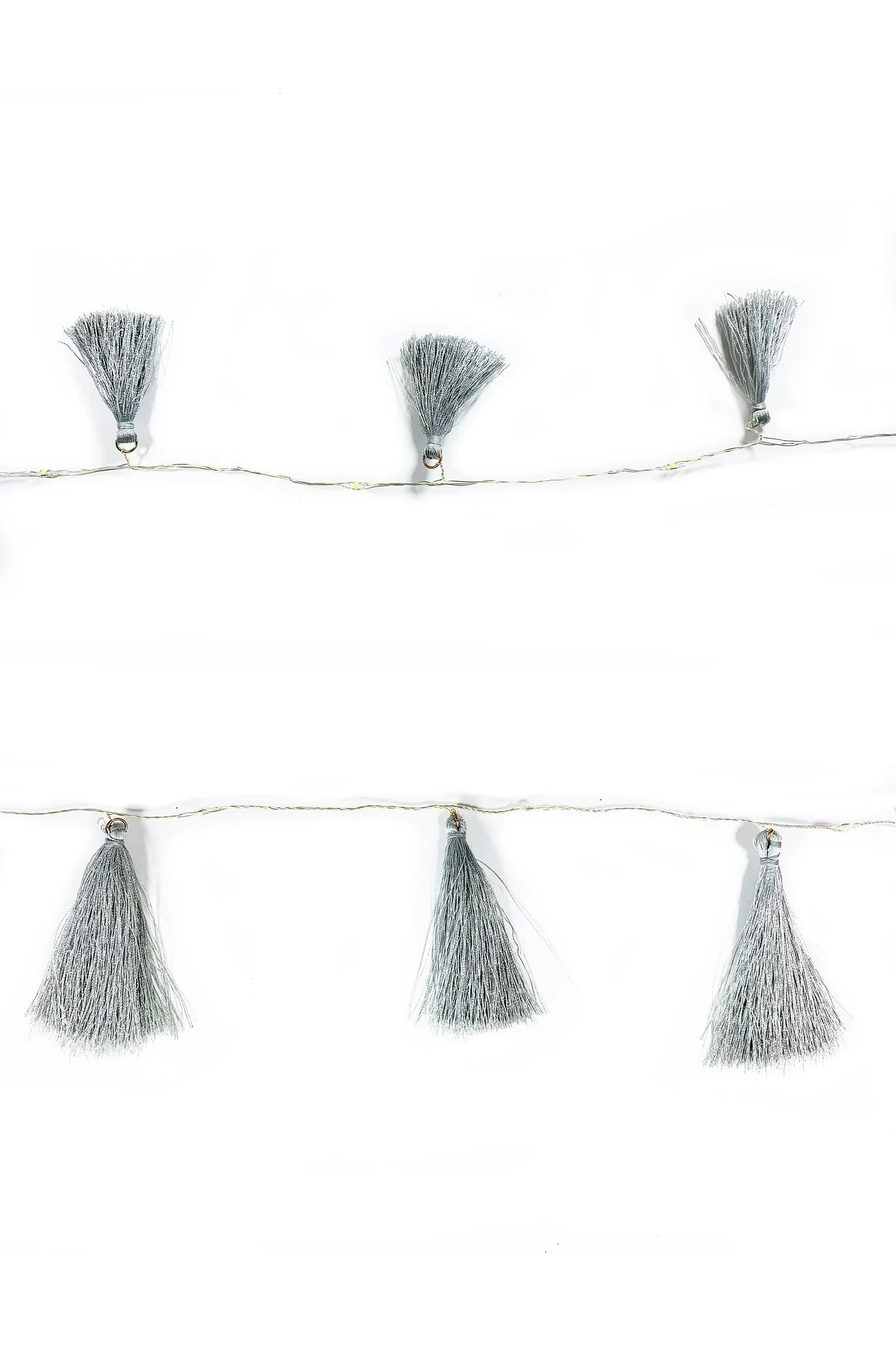 Add a touch of boho charm with these tassel fairy lights. Featuring 20 warm white LEDs on silver copper wire with soft grey tassels, they bring texture and elegance to any space.