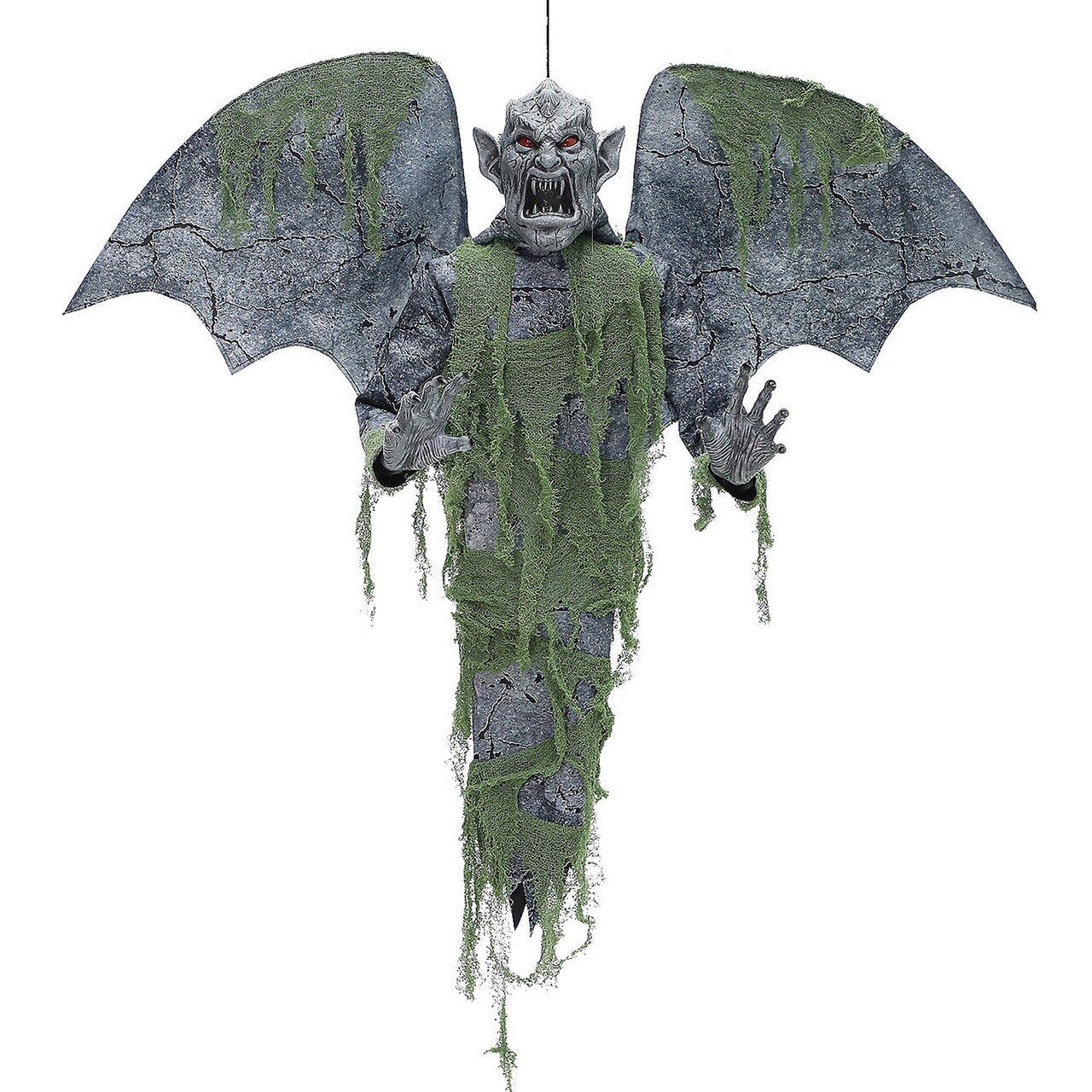 This 40 inch hanging gargoyle prop creates a chilling atmosphere for your haunted scenes. Featuring an ancient stone look with ragged greenish moss, skeletal fingers that move in and out, and a sharp-toothed grimace. Its LED eyes glow icy blue while an ominous bell tolls in the background. Requires 3 AA batteries (not included). Perfect for adding a scary setting to your Halloween décor.