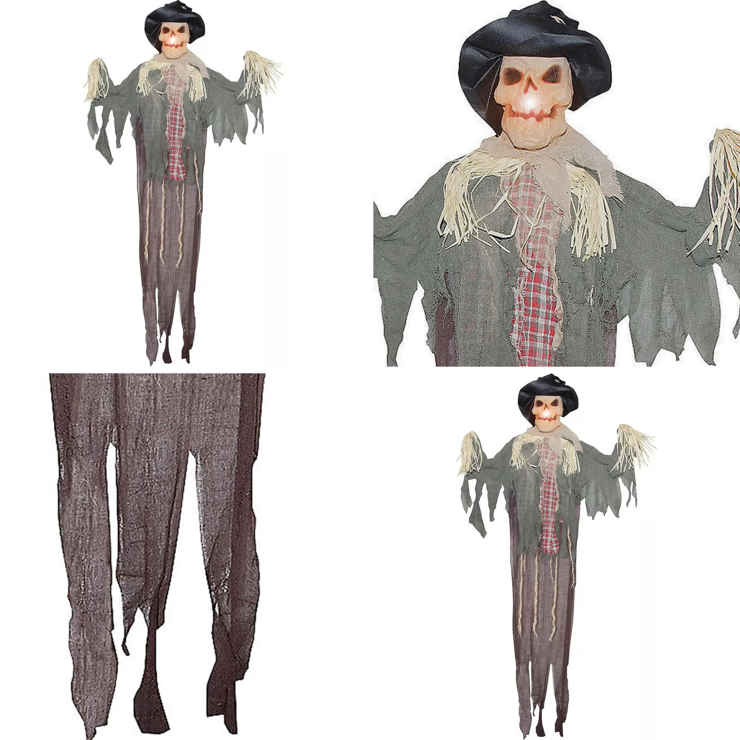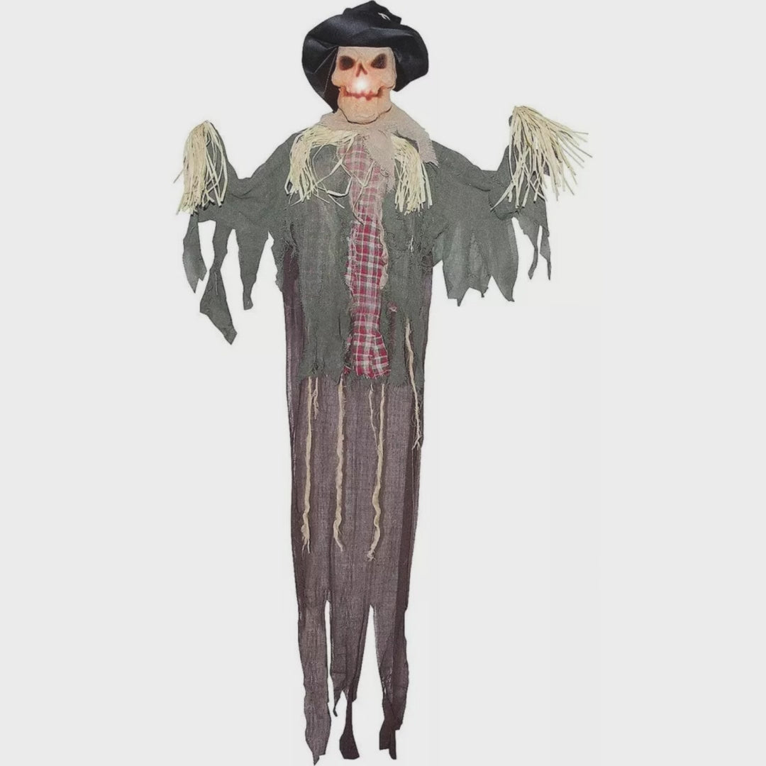 This 72 inch hanging scarecrow is a fearsome Halloween prop perfect for home haunts and haunted houses. Featuring a skull head with light-up eyes, tattered clothes, and a hat, it creates a chilling atmosphere to scare visitors. Made for indoor or covered outdoor use, this scarecrow requires 3 AA batteries (not included) for the light-up feature. A great addition to your spooky Halloween decorations.