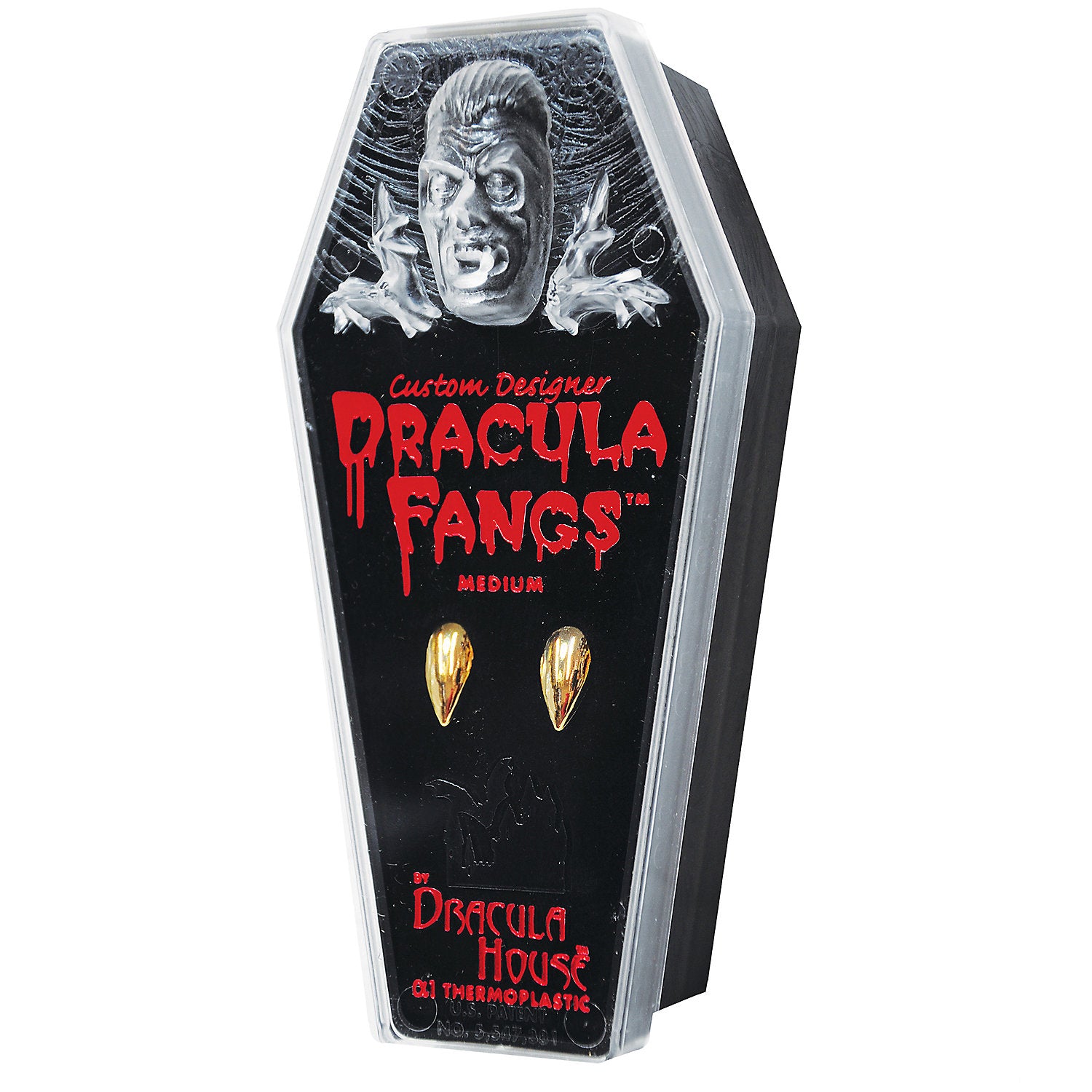 The Original Custom Designer Gold Dracula Fangs are loved by party-goers and actors worldwide because of their natural look and secure fit that enables them to talk easily and naturally, as well as drink cold beverages! Natural tooth color and superior product quality and finish make these the finest fangs available! Custom Designer Fangs can be worn many times without refills or adhesives.