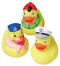 These rubber duckies can be used for so much more than just bath time fun; they're a child's new best buddy. These yellow vinyl rubber duckies wear a variety of different hats for different personalities. Ducks measure 4" Long x 3" wide x 3" tall. These ducks do not squeak. They are weighted and do float upright in calm or moderate water.