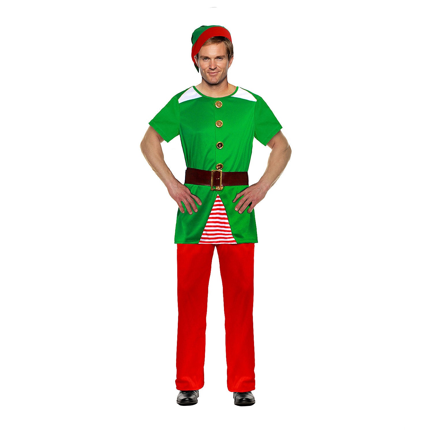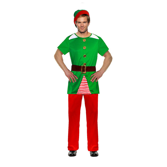 Slip into this comfy costume for a quick, simple way to be a holly jolly elf at your next holiday gathering! This adult elf costume features a colorful green shirt with attached golden buttons, matching soft hat with pom-pom, and elastic waist red pants.