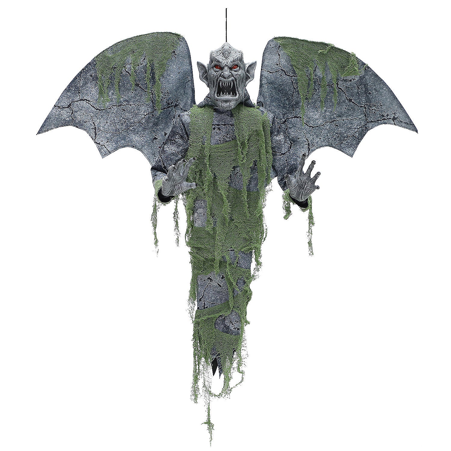 An ancient stone-looking gargoyle hangs and sways while his arms, ending in long skeletal fingers, move in and out, reaching to enfold you in his cold embrace! The grey granite appears to be covered in ragged greenish gauzy moss and is topped by a gruesome gargoyle head displaying a sharp-toothed grimace. His LED eyes glow with an icy blue stare while an ominous bell tolls in the background.