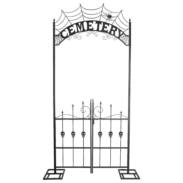 Set up a grand entrance to your Halloween yard decor with this impressive 8.5 foot Cemetery Archway Gate! The upper arch is festooned with spider webs, spiders and scrollwork, while the gate doors have skull accents. Sturdy metal bases give a secure foundation.