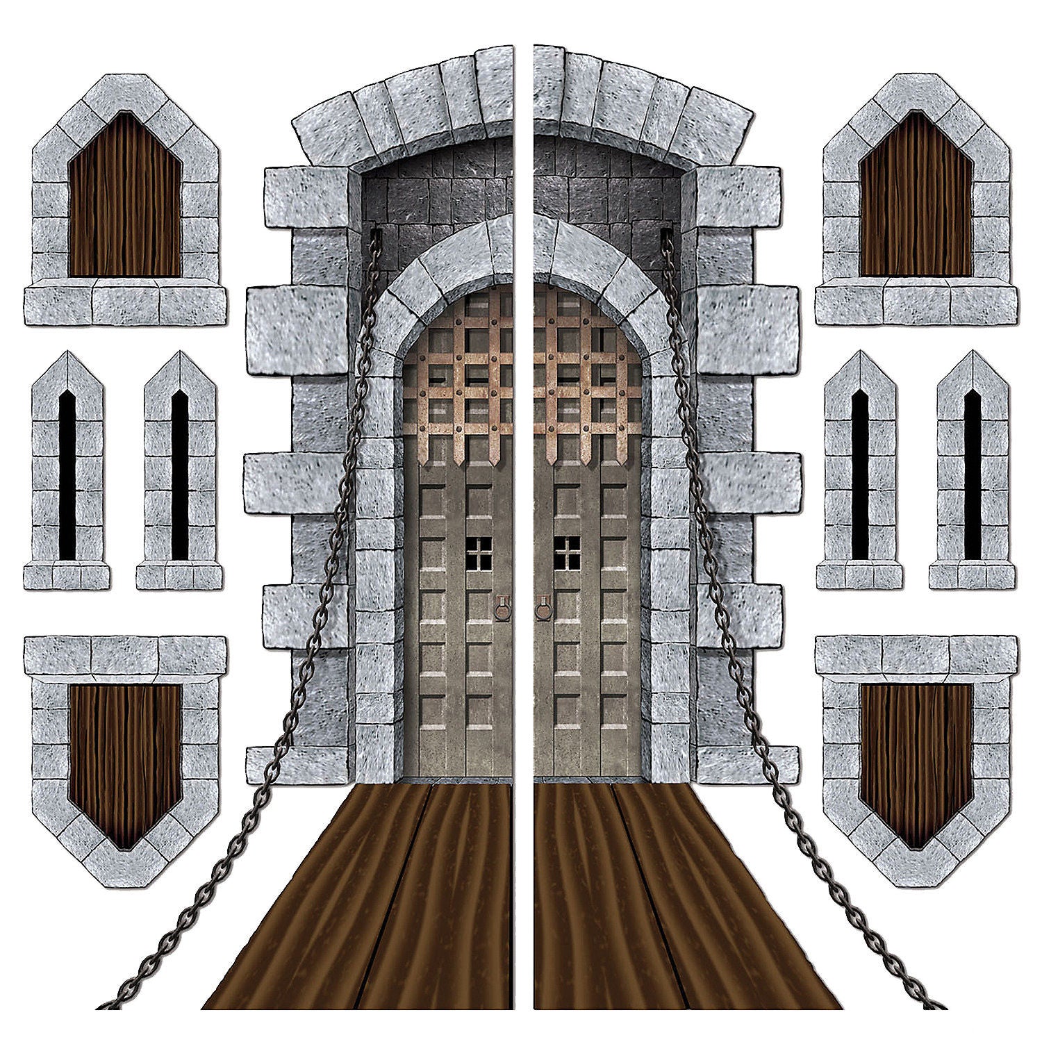 Enhance your festive atmosphere with our Castle Door and Window Props, perfect for princess parties or royal events. This set includes nine props, featuring one impressive castle door prop and eight different window props to create a magical setting.