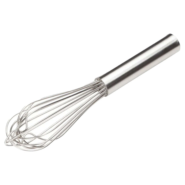 The 10" French whip is built for precise mixing and smooth blending, featuring a durable stainless steel build ideal for sauces, batters, and eggs in professional kitchens.
