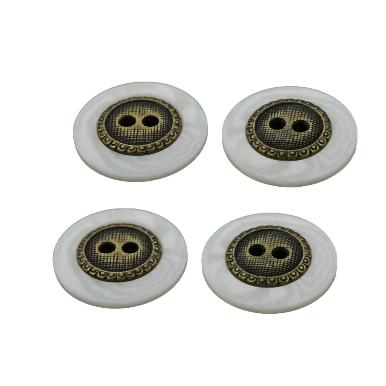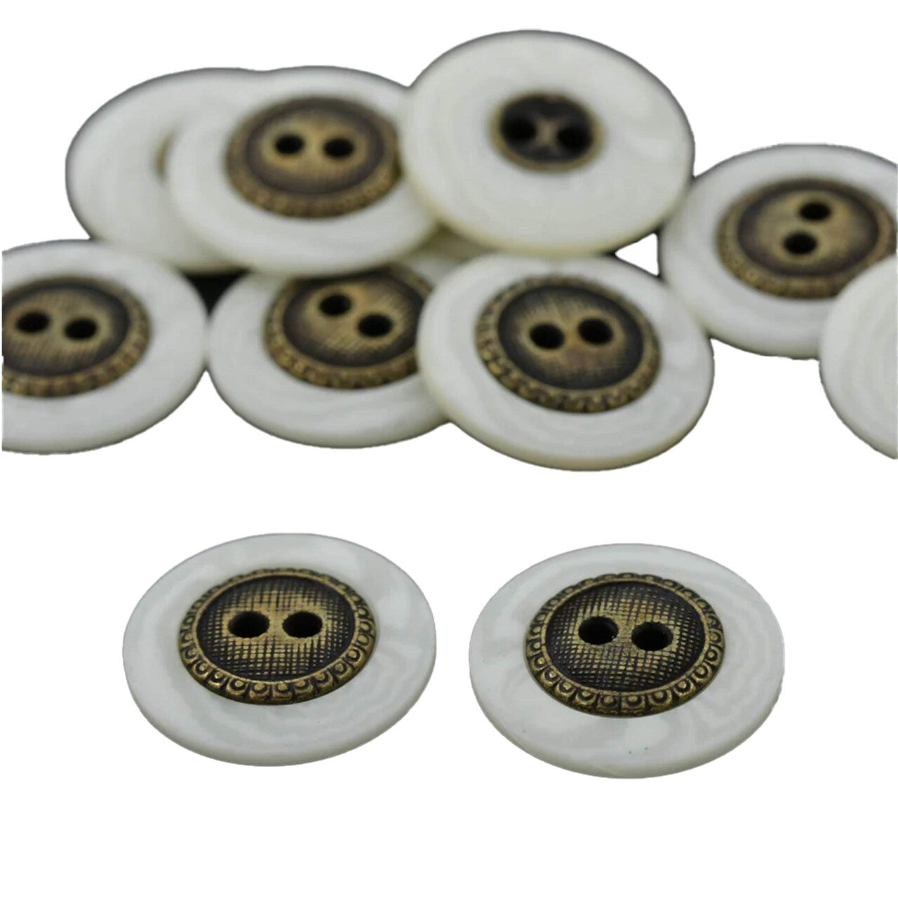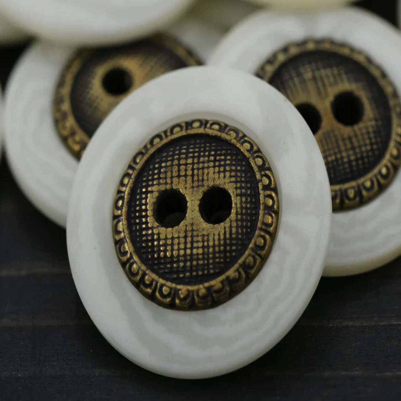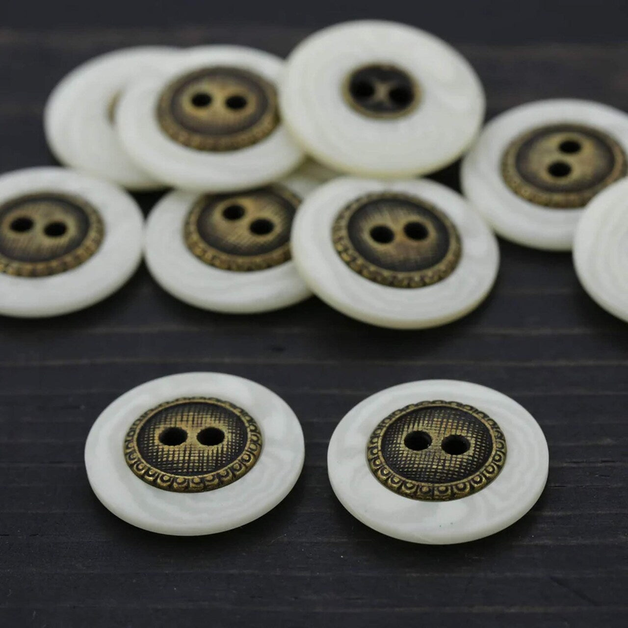 Elevate your sewing projects with these Ivory and Bronze Decorative Plastic Buttons. Perfect for shirts or blouses, these small buttons feature a classic two-tone design that adds a subtle, stylish accent to any garment.